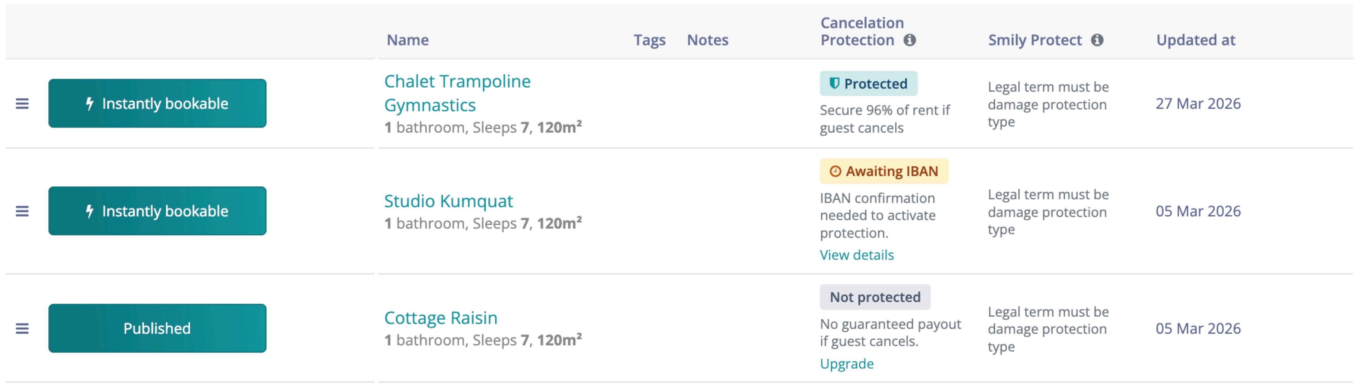 - Protection status per channel (Airbnb, Booking.com)