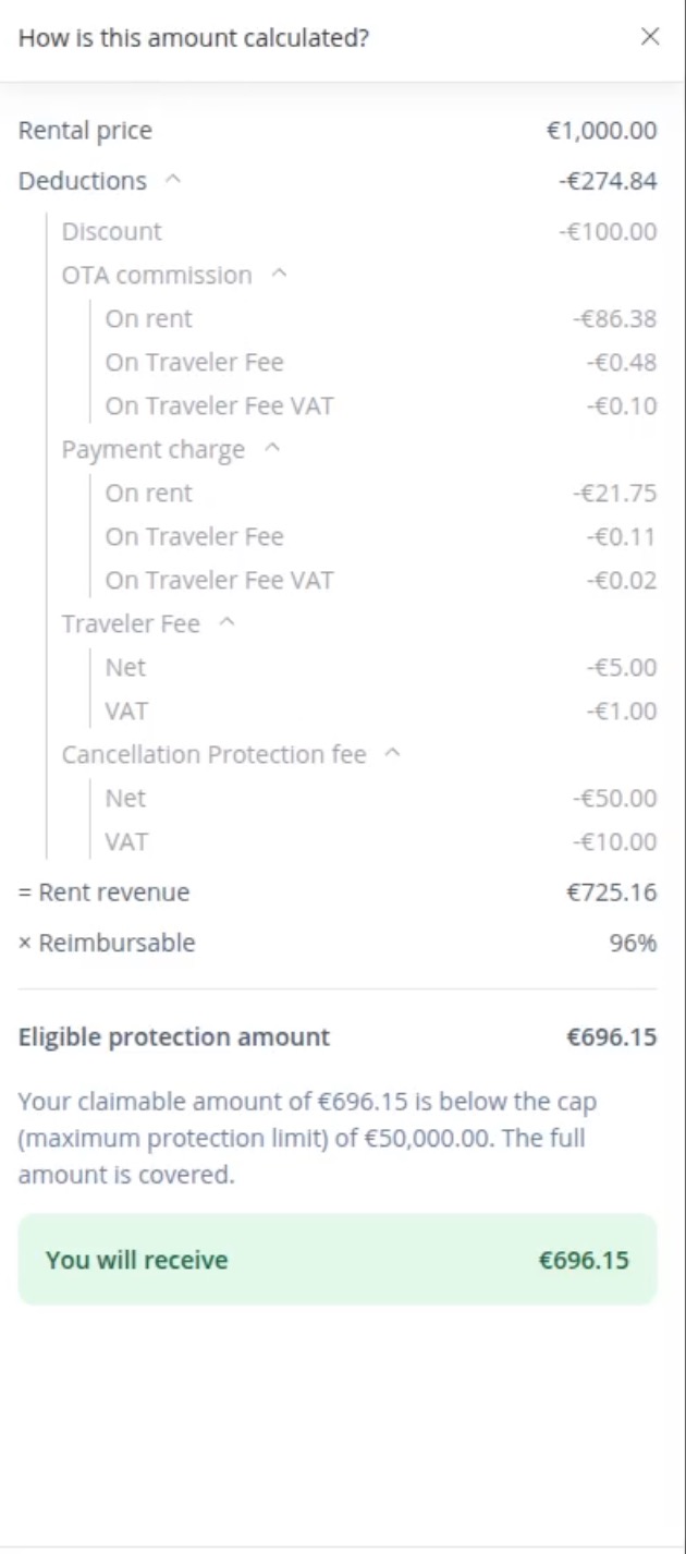 Instead, the payout is based on the eligible Cancellation Protection base (net eligible rental revenue, excluding non-covered elements such as city tax, certain fees, OTA commissions, etc.), and the loss is assessed night by night: