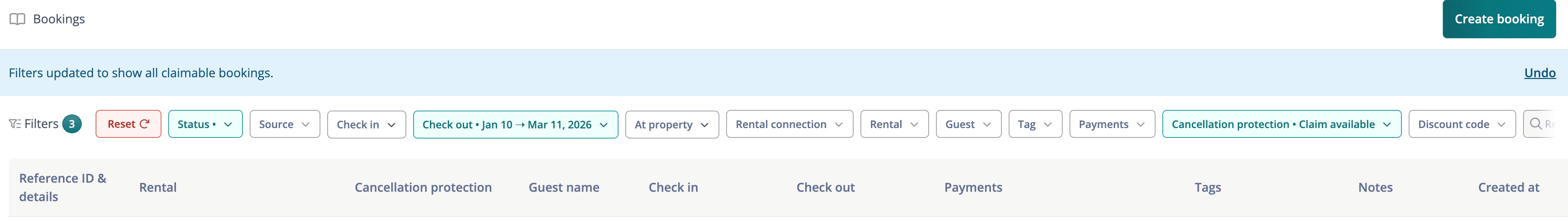 When the account enrolls in cancellation protection, a new column appears showing the protection status, making it easy to filter bookings by status (Non-refundable, Protected, Claim available, Claim submitted, Not Protected, Not applicable, Claim Refunded).