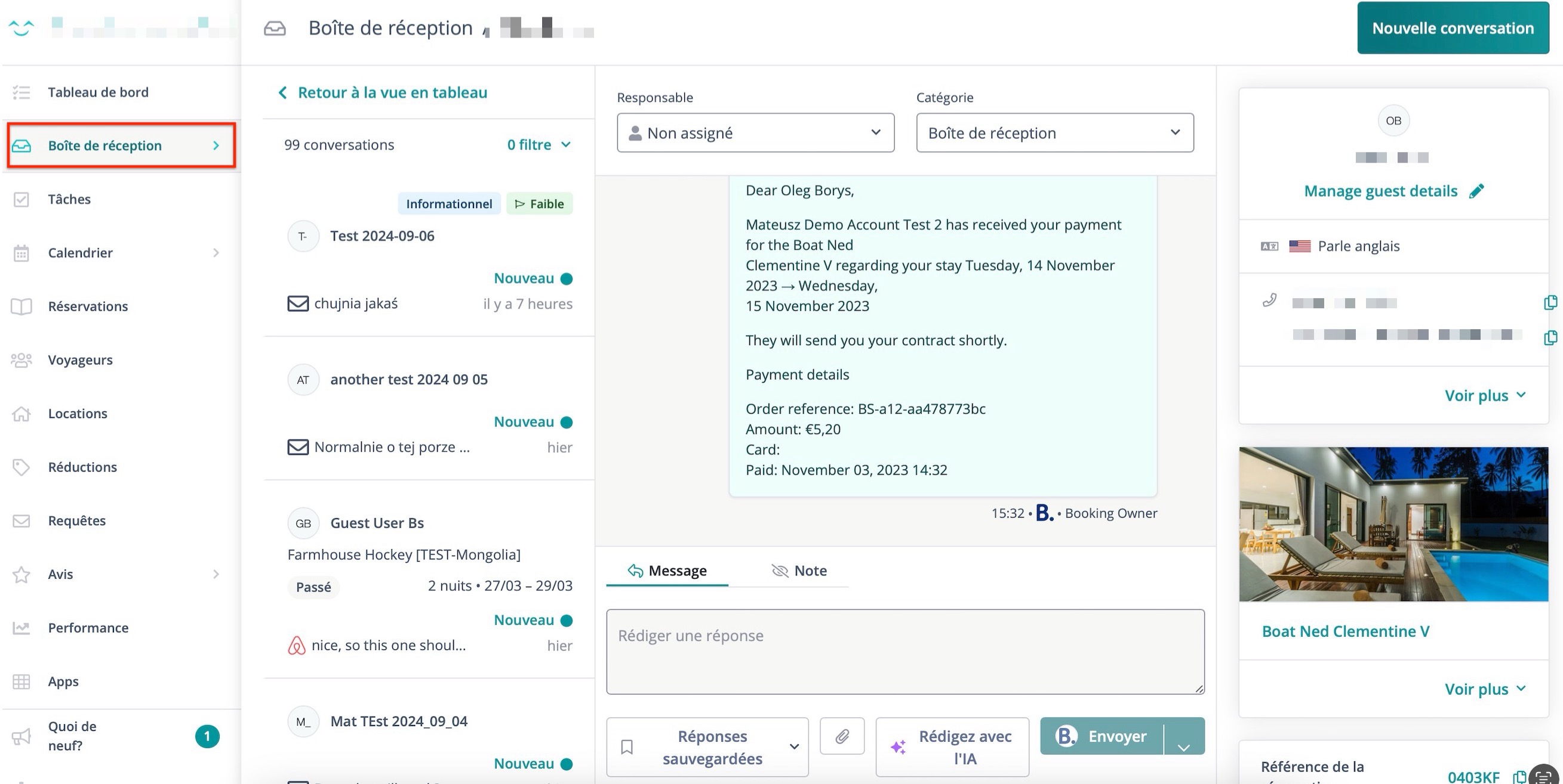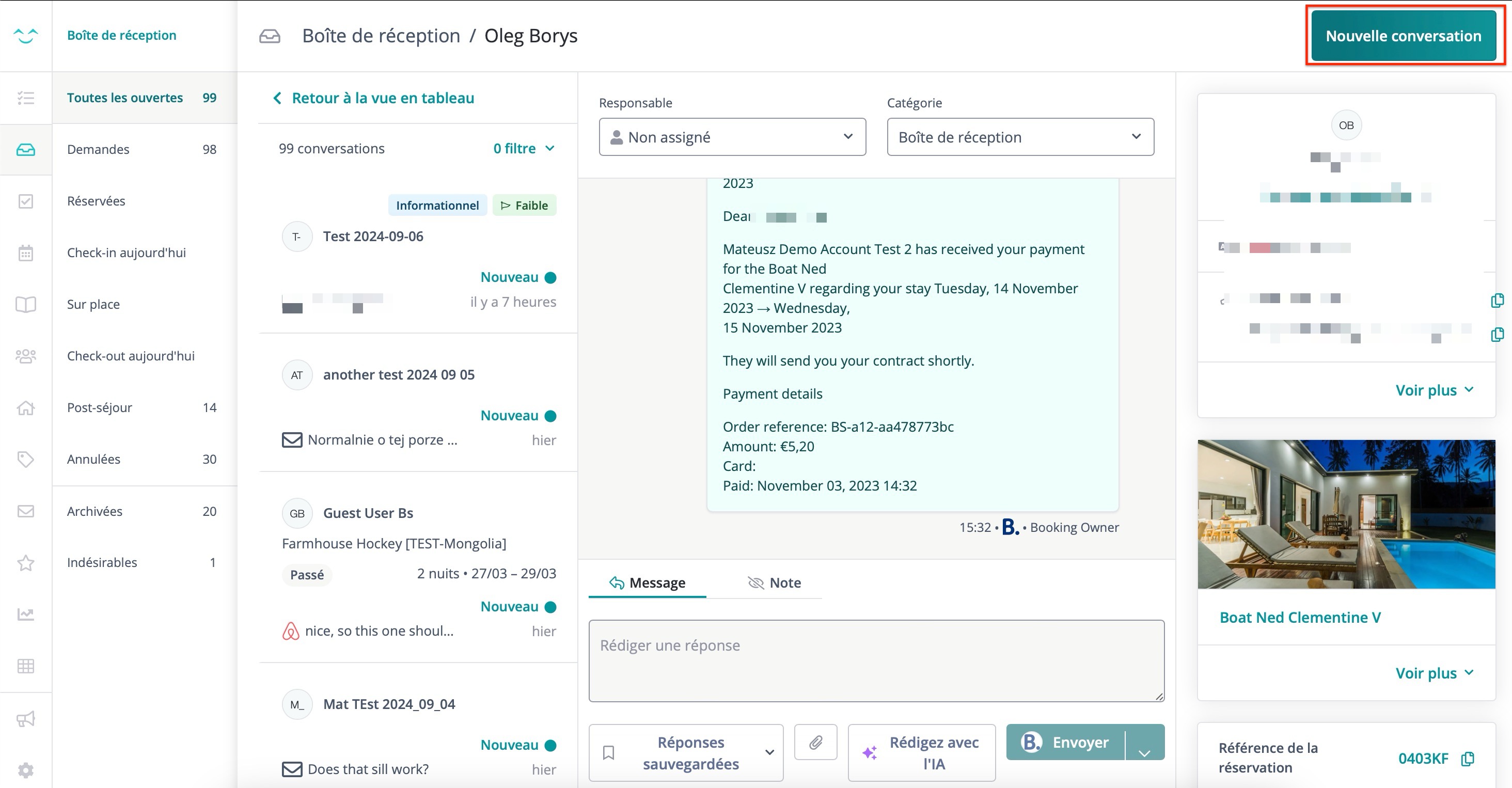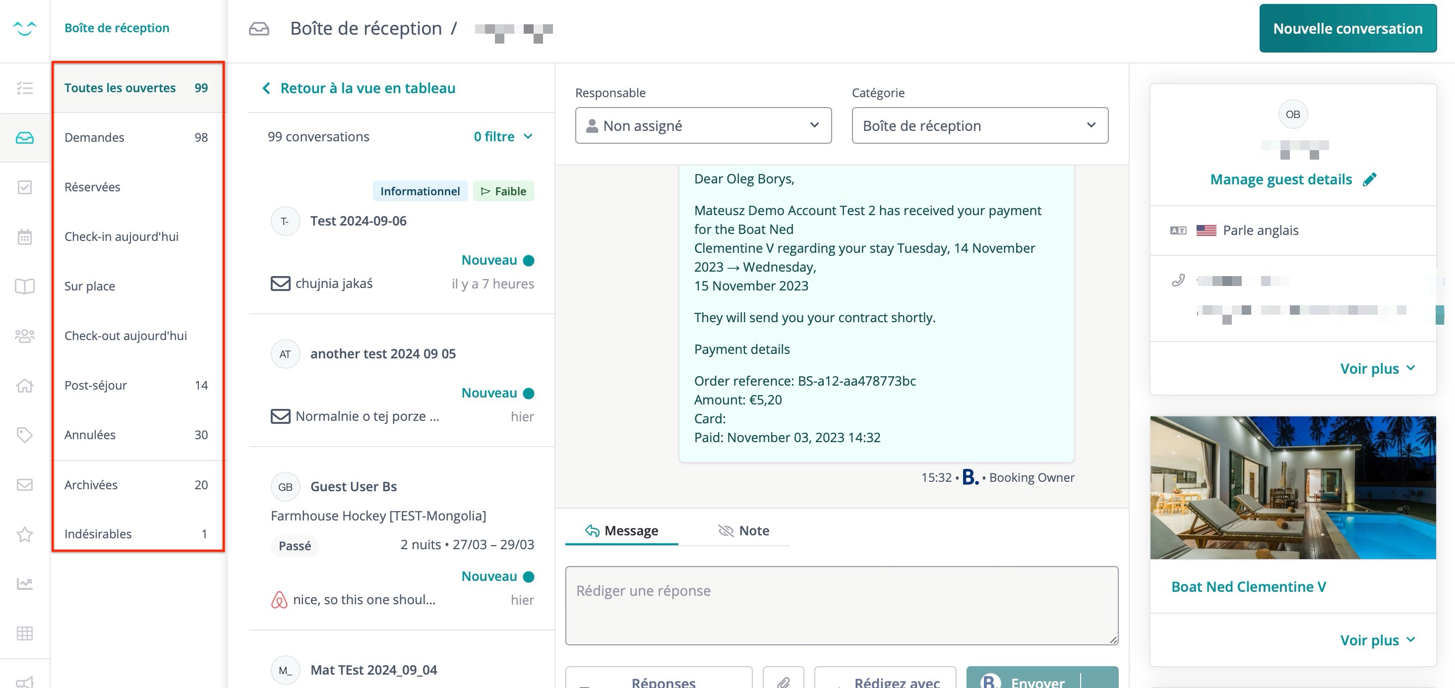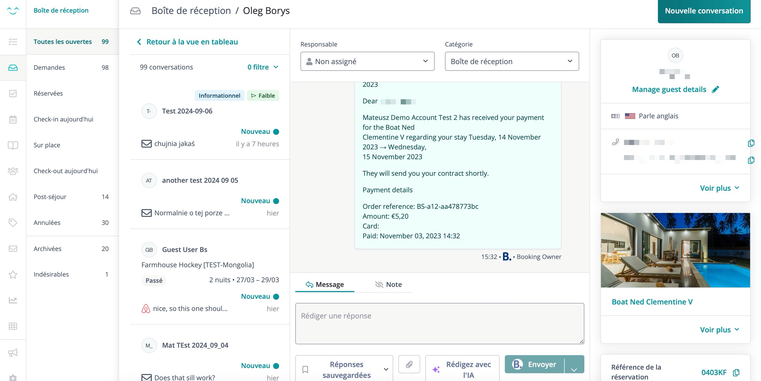 En cliquant sur une conversation spécifique, vous accéderez à la vue détaillée de la conversation. Vous y trouverez le fil de discussion complet, des outils de rédaction de messages, et des informations sur les invités et les réservations.