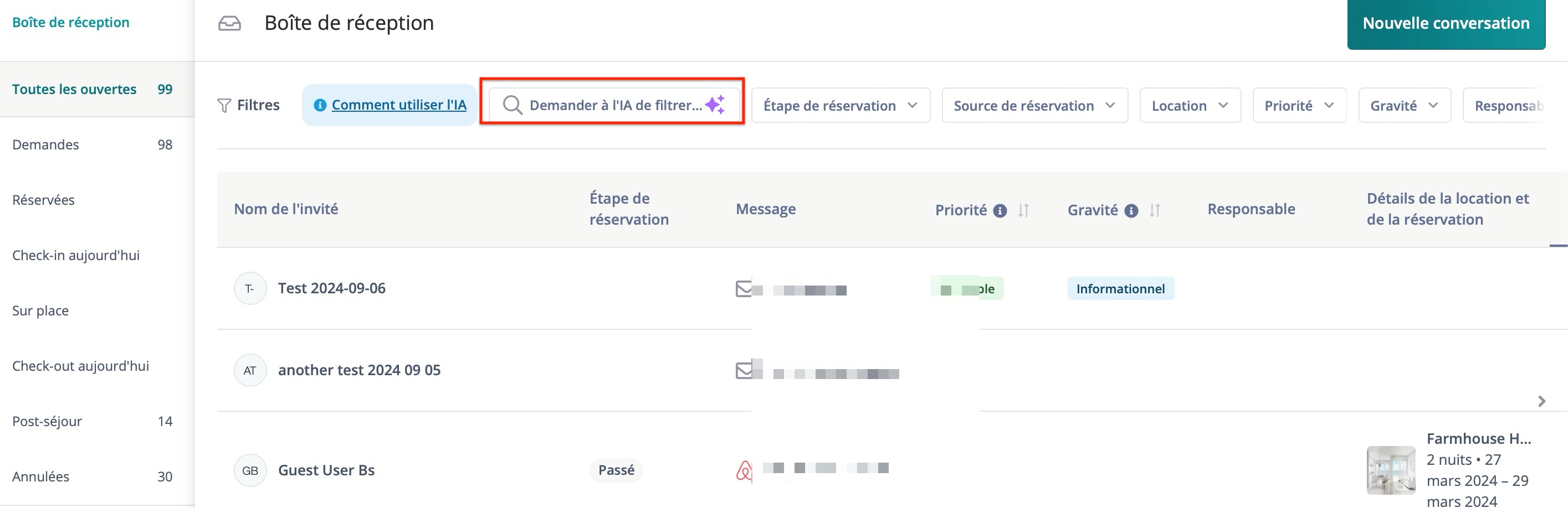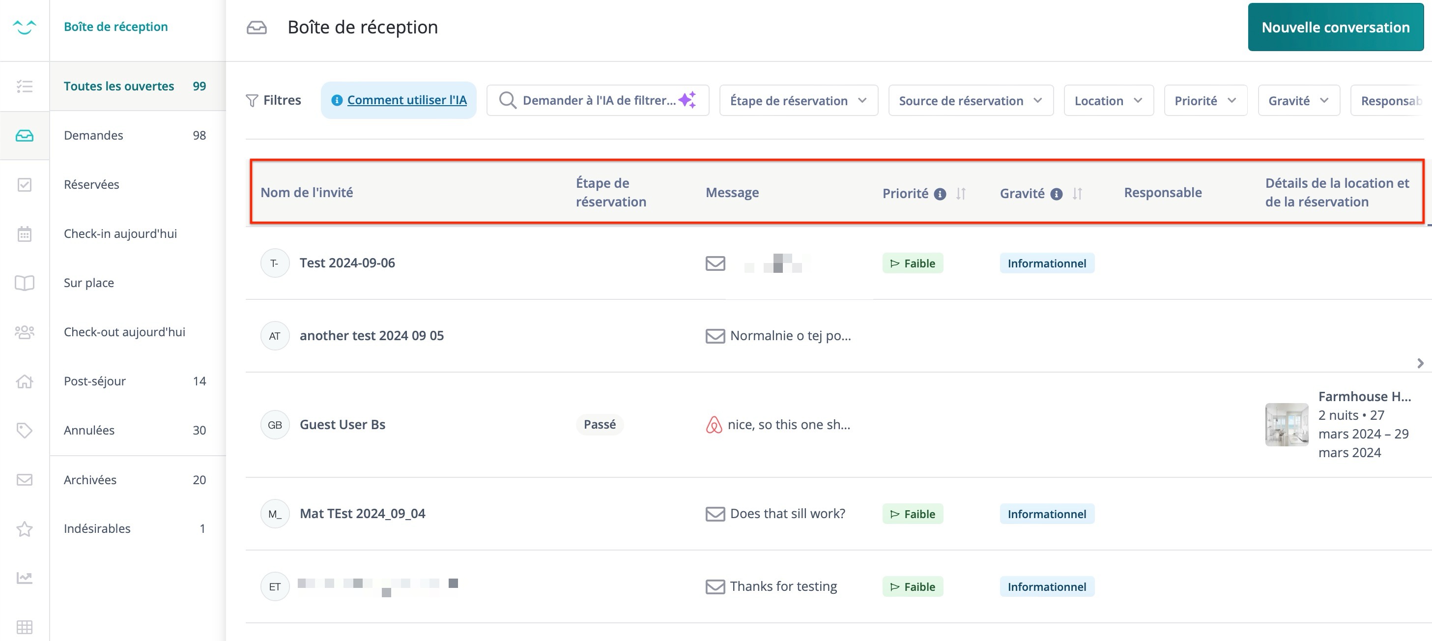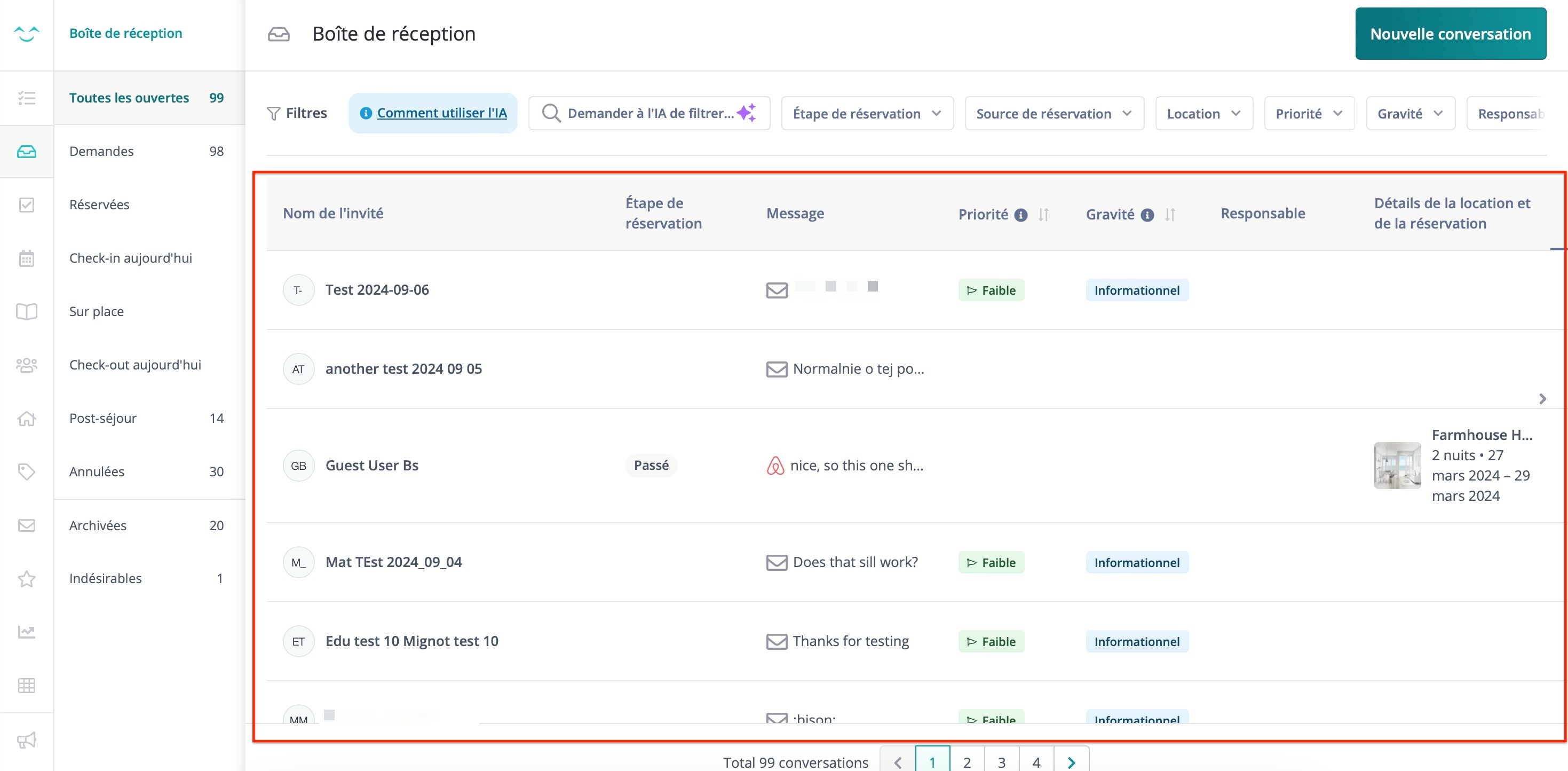 Cette vue donne un aperçu général des conversations avec des détails tels que le nom de l'invité, le stade de la réservation, l'aperçu du message, etc.