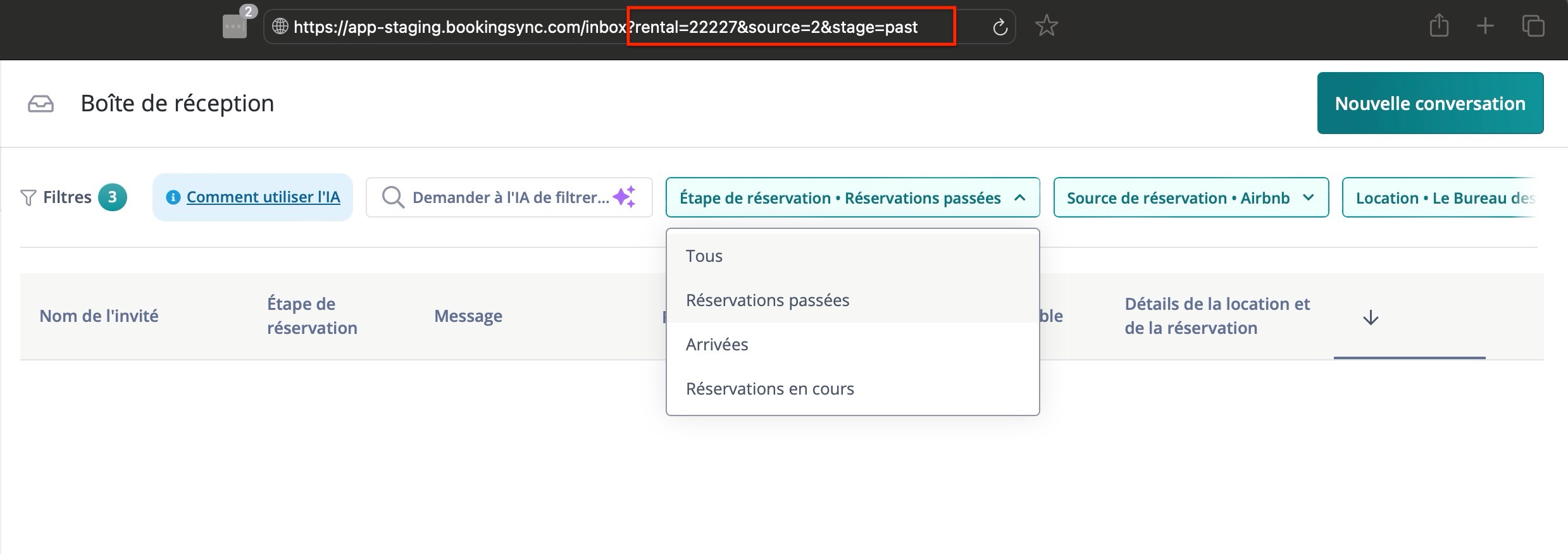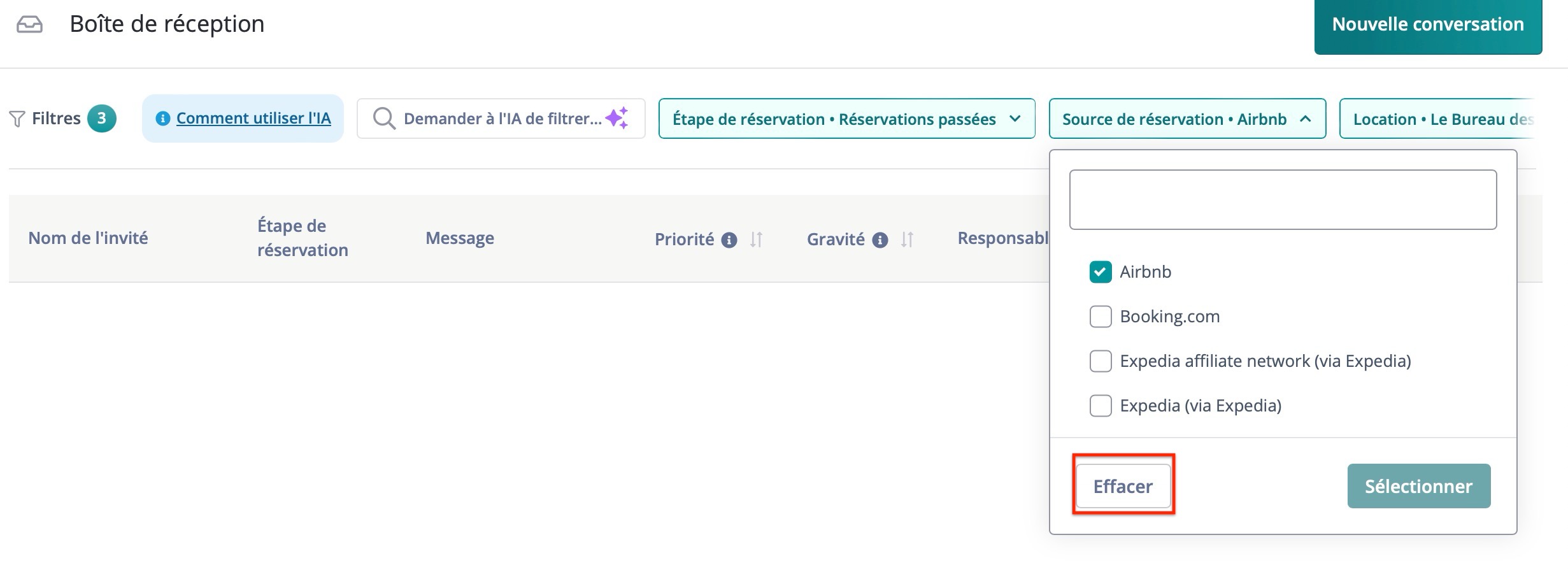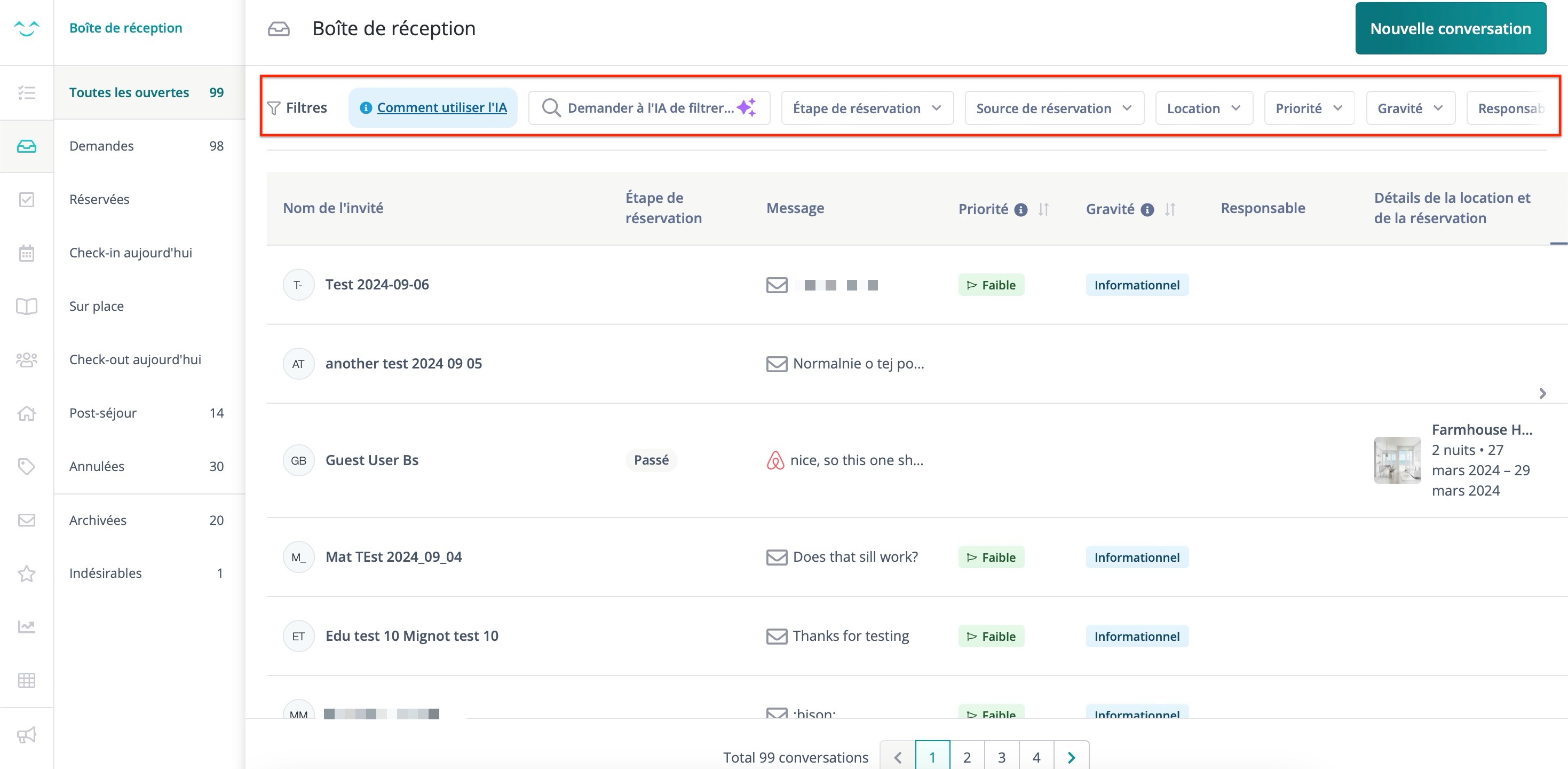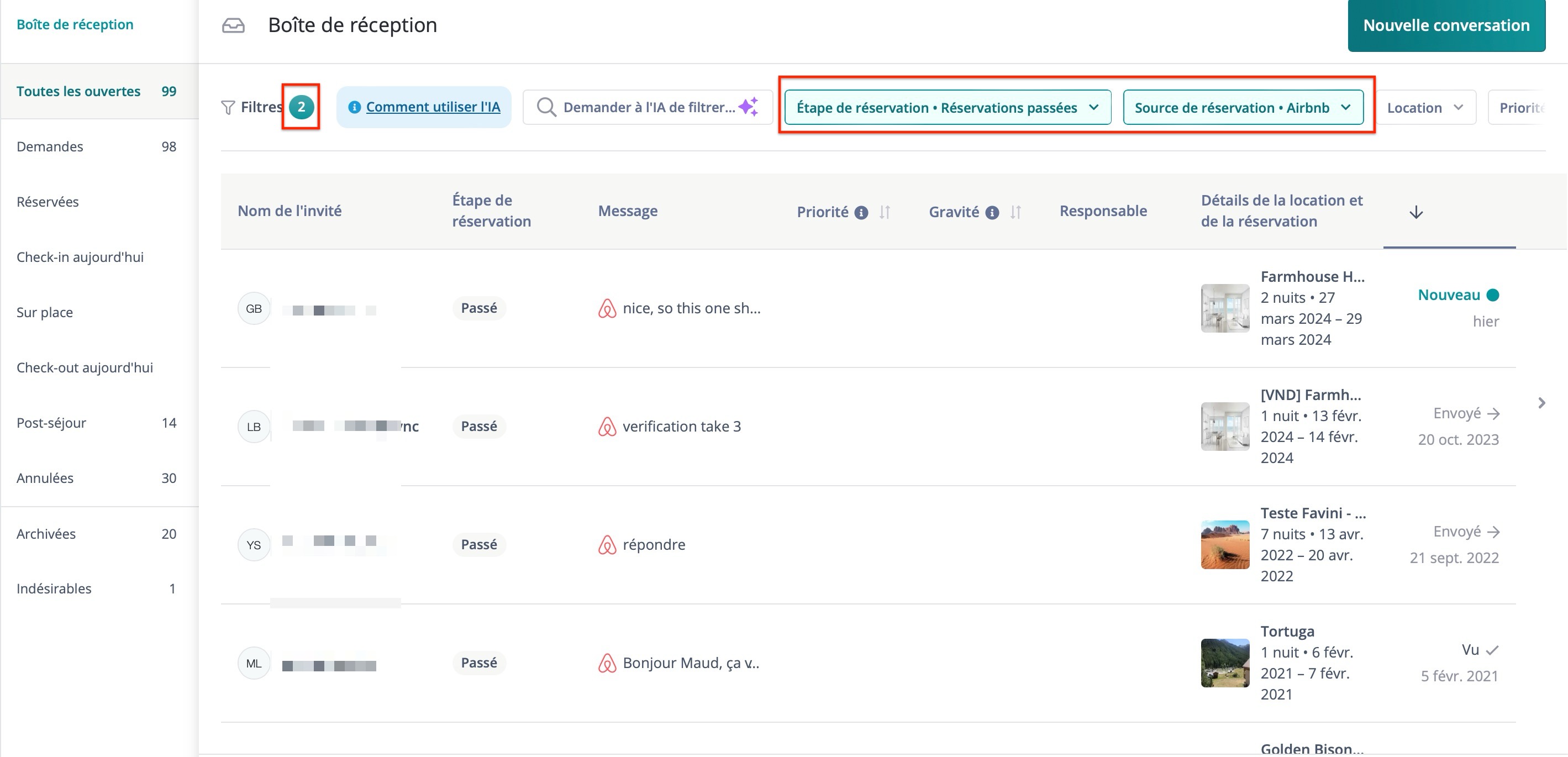 Cette vue donne un aperçu général des conversations avec des détails tels que le nom de l'invité, le stade de la réservation, l'aperçu du message, etc.