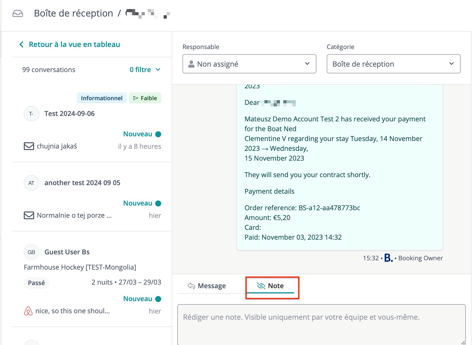 - Ajout de notes : Utilisez la fonction "Notes" pour ajouter des commentaires internes ou des rappels liés à une conversation.