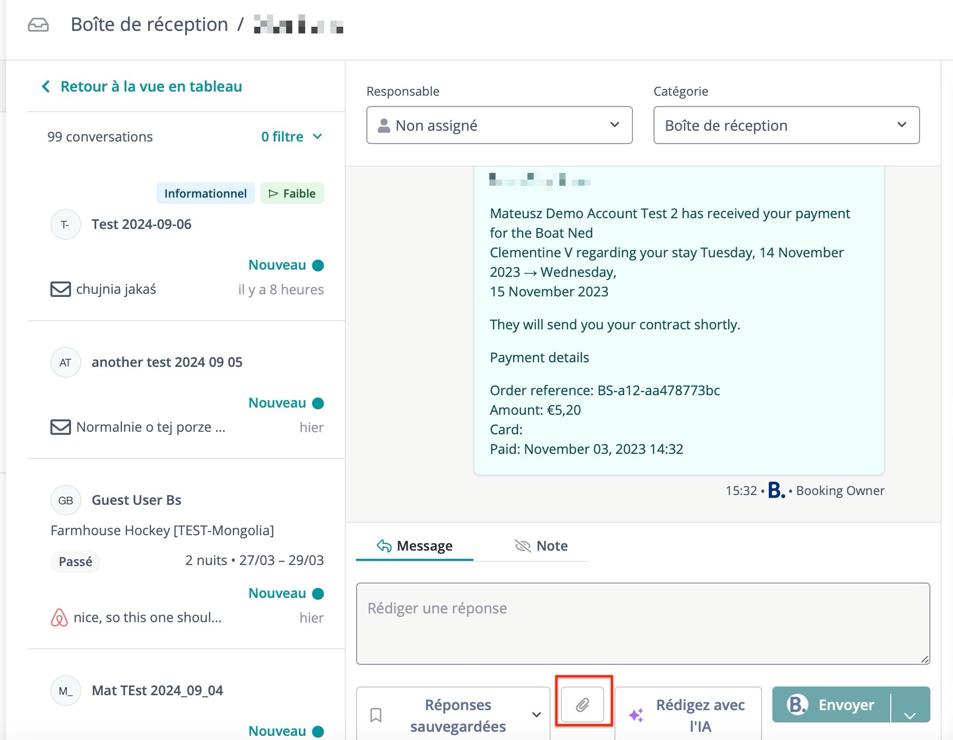 L'assistant IA peut vous aider à rédiger des réponses rapidement en utilisant les informations de la réservation et des conversations passées.