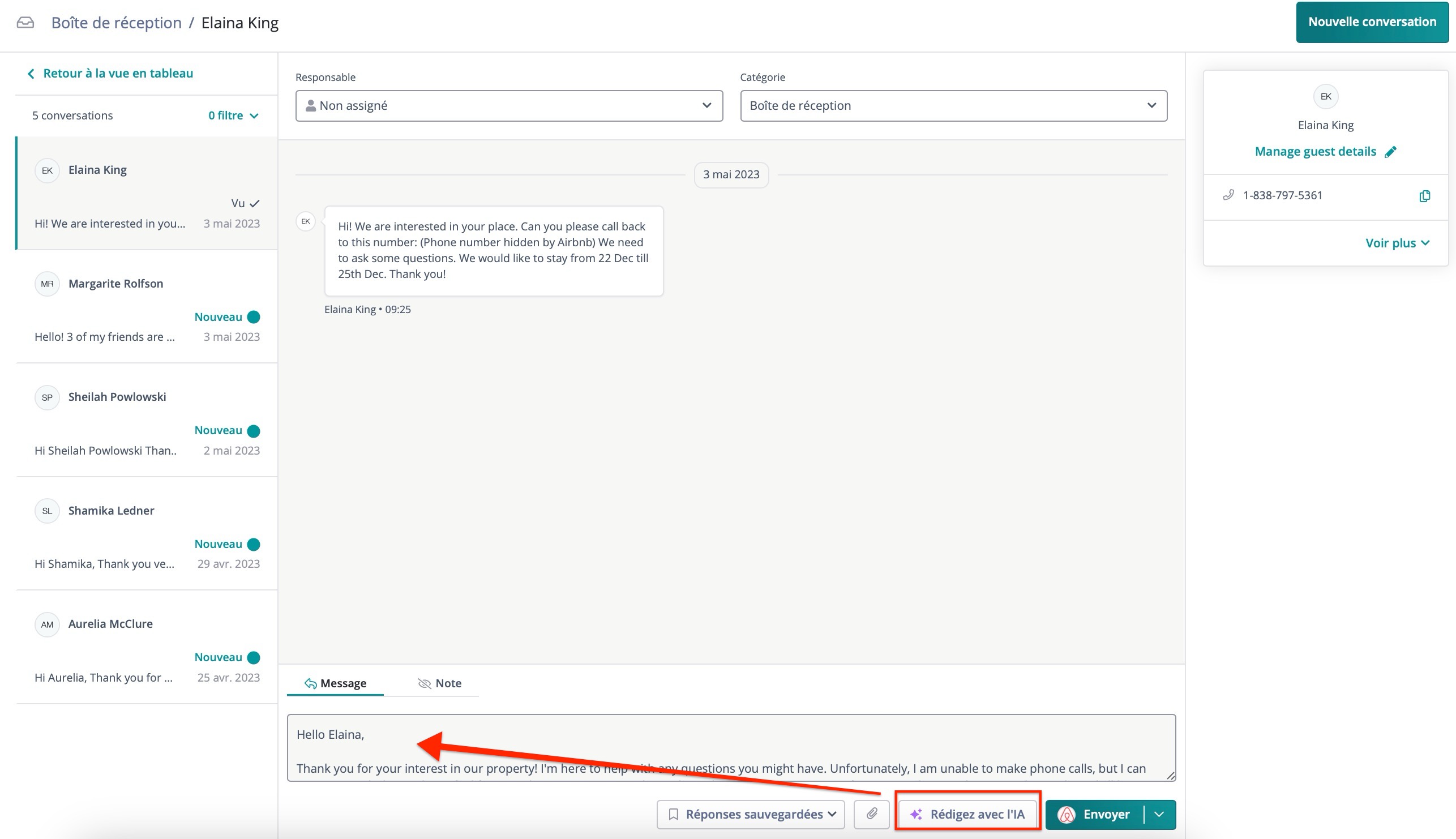 La fonction "Rédiger avec l'IA" vous aide à rédiger des réponses basées sur la conversation, les informations sur l'invité et les détails de la réservation. L'IA utilise un modèle soigneusement conçu pour garantir que la réponse est précise, professionnelle et personnalisée.