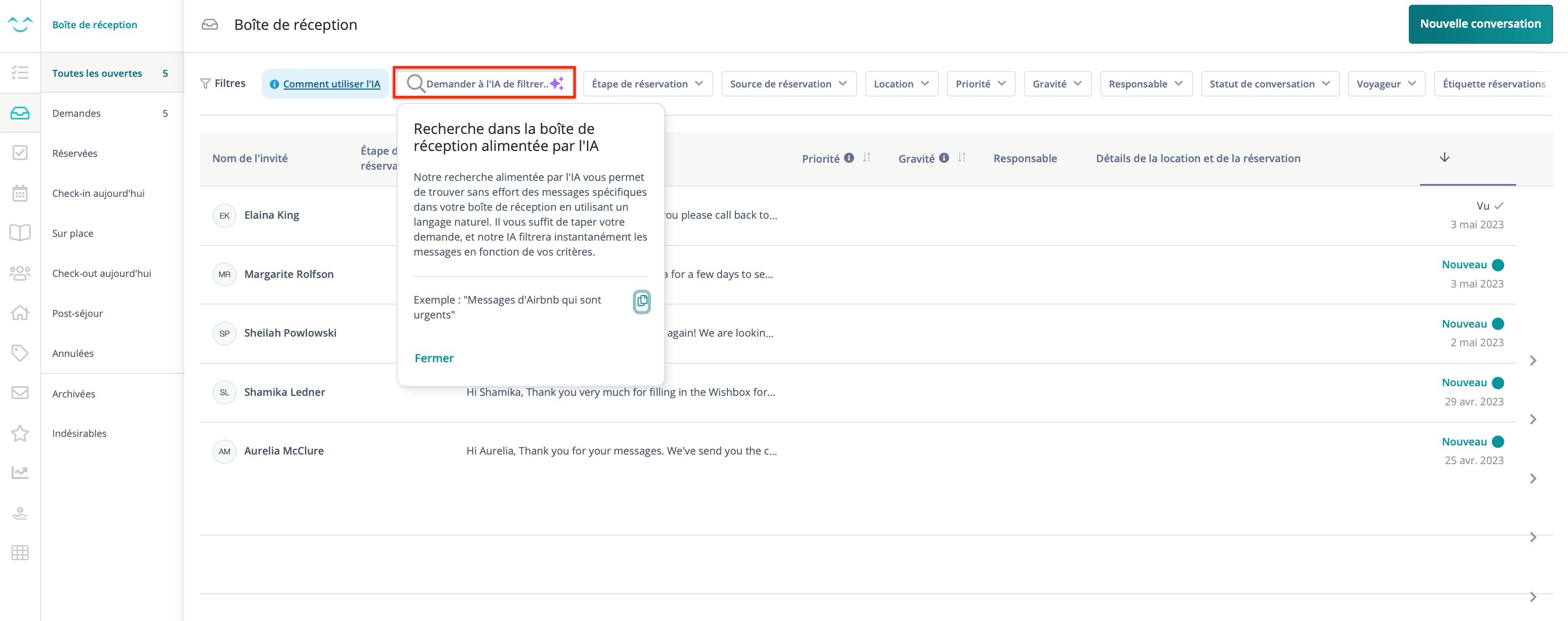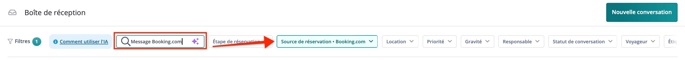 - L'IA Applique les Filtres : L'IA interprétera votre requête et appliquera automatiquement les filtres pertinents (par exemple, source de réservation, date de réception).