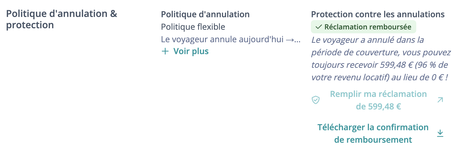 La Protection Annulation vous permet d'offrir aux voyageurs une option de réservation flexible où ils peuvent annuler pour un remboursement complet (jusqu'à 1 jour avant l'arrivée), tandis que vous recevez toujours 96 % de vos revenus locatifs. Les voyageurs paient un prix plus élevé pour cette flexibilité.