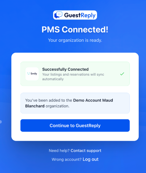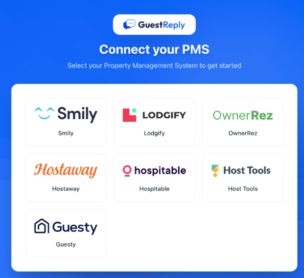 Cliquez sur l’app GuestReply et créez un compte ou connectez-vous. Sélectionnez Smily dans la liste des intégrations PMS disponibles, puis cliquez sur Link Account.