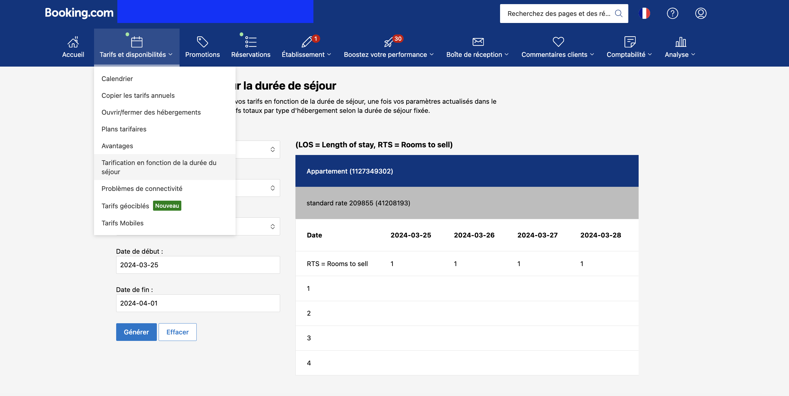 Le tableau des prix selon la durée du séjour se trouve dans votre extranet Booking.com, sous Tarifs et Disponibilités.