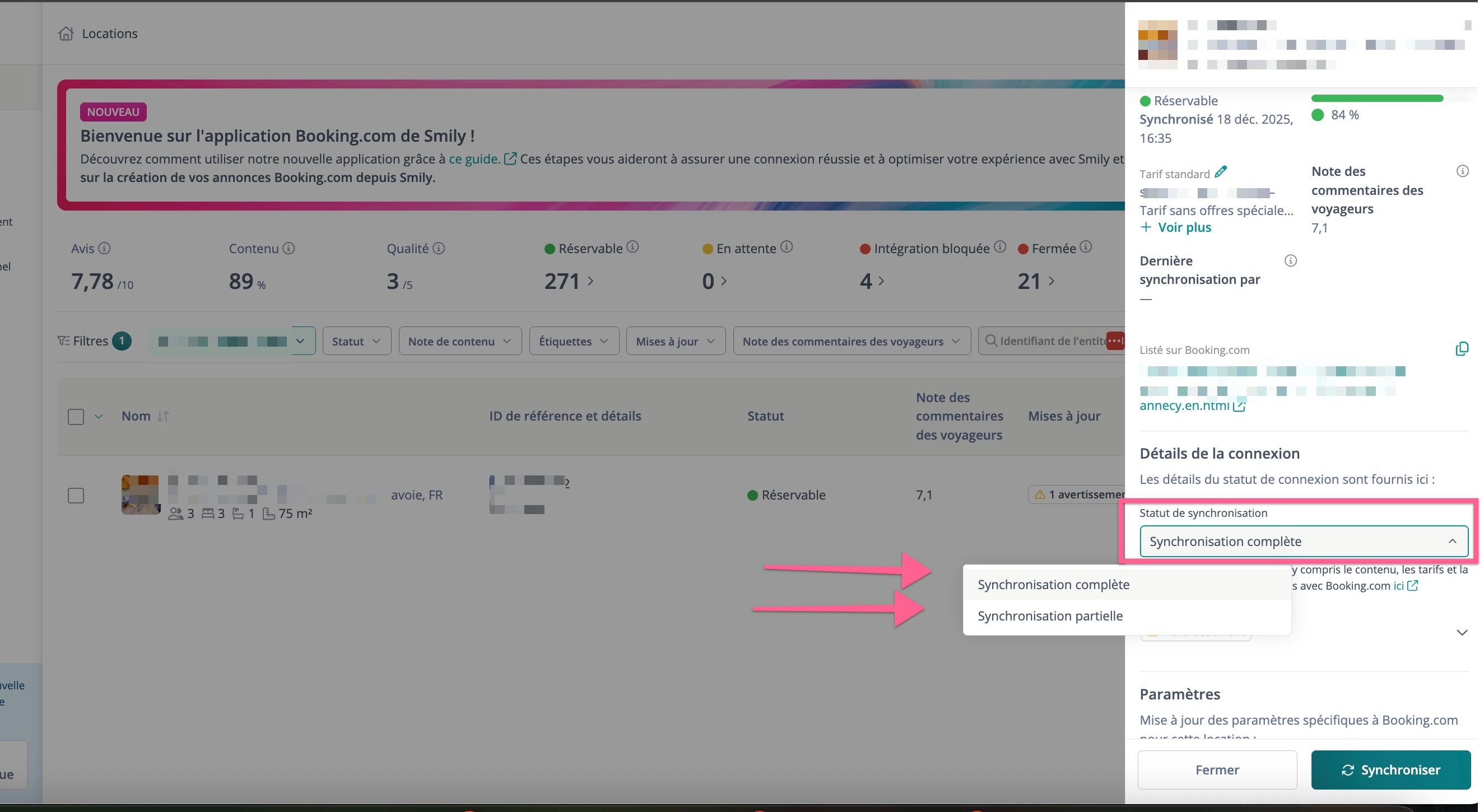 Note 1 : Les propriétés que vous poussez et créez depuis BookingSync vers Booking.com (comme expliqué ici) sont automatiquement définies en Synchronisation Complète (CAPI).